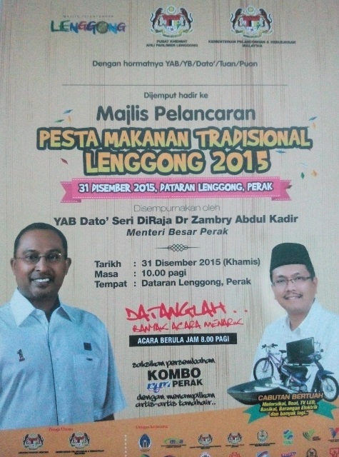 Dijemput semua hadir bagi memeriahkan Pesta Makanan Tradisional Lenggong 2015. Pelbagai jenis makanan tradisional seperti lauk pauk dan kuih muih akan disajikan. Pesta ini diadakan bertujuan memperkenalkan pelbagai jenis makanan yang terdapat di Lenggong disamping dapat mengeratkan hubungan sesama insan.Cabutan bertuah juga akan diadakan. Pesta Makanan Tradisional ini akan disempurnakan oleh YAB Dato’ Seri DiRaja Dr Zambry Abdul Kadir iaitu Menteri Besar Perak. Moh kite…